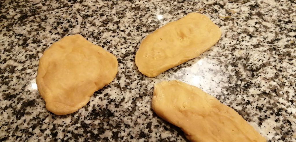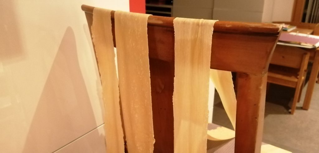 Solag des Kraut abkiahlad, aus dem Doig a Rolla forma und Scheiba rabschneida. Dia Scheiba in Mähl daucha ond mit ra Nudlamaschena hauchdünne Stroifa macha. Dia Stroifa zom Droggna am beschda iber en Stuahl henga.