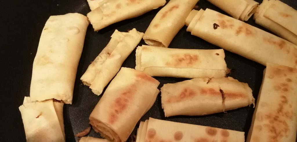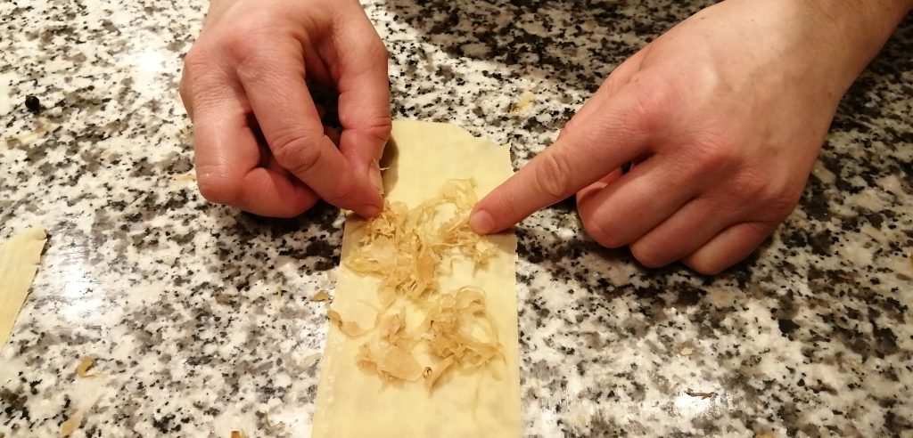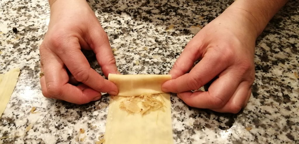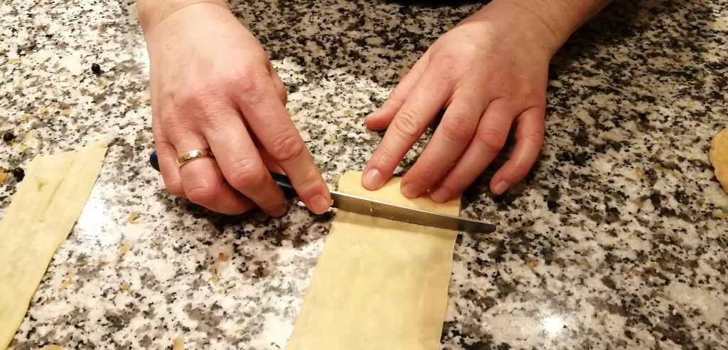 S`Kraut auf dia Doigstroifa lega und aufwiggla und denn den Doig abschneida. Wenn dia Stroifa z`broit sind, oimol in dr Mitte durchschneida.