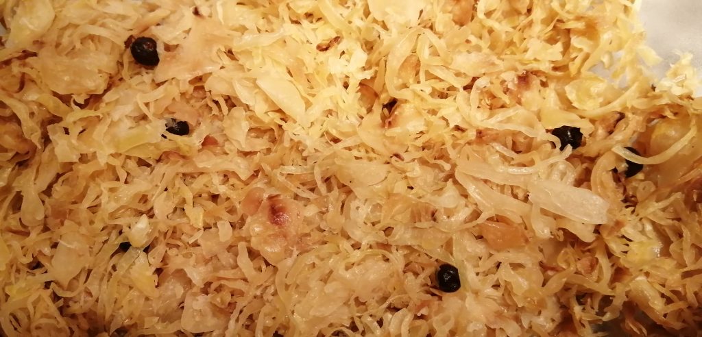 Sauerkraut (am Beschda a Oiga gmachtes) ausdrugga und in ra Pfanna mit Budder oder Schmalz adünsta. Denn abkiahla lassa, sonsch verbrensch dr nochher d `Finger.